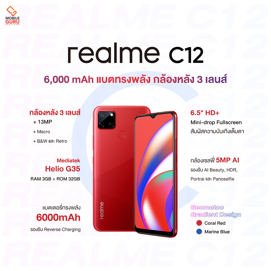 realme ประเทศไทย เตรียมที่จะเปิดตัวและประกาศวันวางจำหน่ายอย่างเป็นทางการของ realme C12 ในประเทศไทยเร็วๆ นี้แล้ว ซึ่งคาดว่าราคาวางจำหน่ายน่าจะน่ารักตามสไตล์แบรนด์เรียลมีอยู่แล้ว พร้อมกับมีสีตัวเครื่องให้เลือกด้วยกันทั้งหมด 2 สี คือ สีน้ำเงิน (Marine Blue) และสีแดง (Coral Red) ส่วนรายละเอียดอื่นๆ เพิ่มเติม สามารถติดตามความเคลื่อนไหวกันต่อได้ที่ Mobile GURU Thailand ซึ่งหากมีข้อมูลอะไรเพิ่มเติมเราจะอัปเดตให้ทราบกันแน่นอนครับ