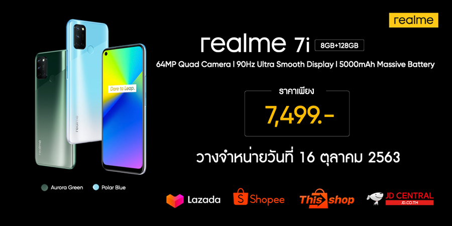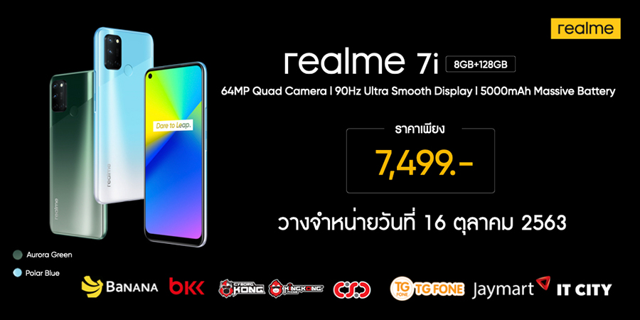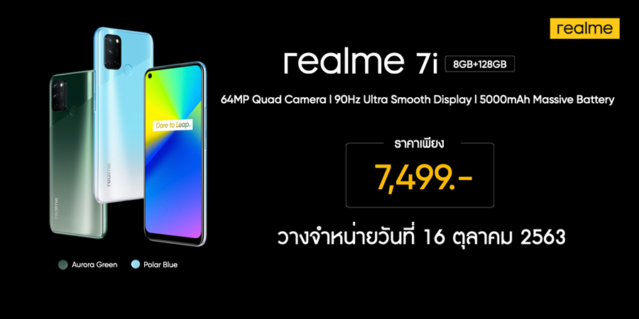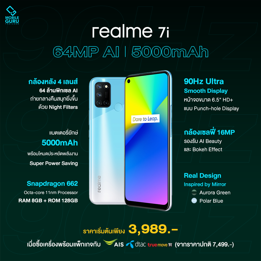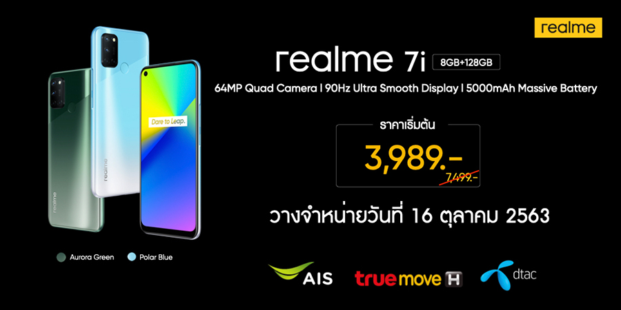realme 7i มาพร้อมสีตัวเครื่องให้เลือกทั้งหมด 2 สี คือ สีเขียว Aurora Green และสีฟ้า Polar Blue วางจำหน่ายในราคาเปิดตัว 7,499 บาท หรือซื้อผูกแพ็กเกจผ่านช่องทางโอเปอเรเตอร์ AIS, dtac และ Truemove H ราคาเริ่มต้นเพียง 3,989 บาทเท่านั้น พร้อมผ่อน 0% นานสูงสุด 6 เดือน