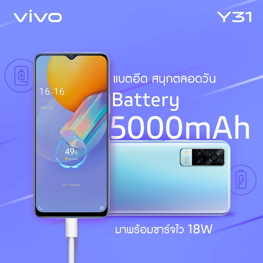 เคยไหมกับการที่ออกไปทำงานนอกสถานที่แล้วแบตเตอรี่มือถือหมดกระทันหัน หรือระหว่างที่กำลังเล่นเกมมันส์ๆ แต่แบตเตอรี่ลดฮวบจนทำให้หงุดหงิด แต่ใน Vivo Y31 มาพร้อมกับแบตเตอรี่ความจุถึง 5000 mAh รองรับการชาร์จไว 18W พร้อมมอบประสบการณ์ให้คุณประทับใจได้อย่างไม่มีสะดุด จะออกไปเที่ยวที่ไหน ก็ไม่ต้องพกสายชาร์จแล้ว