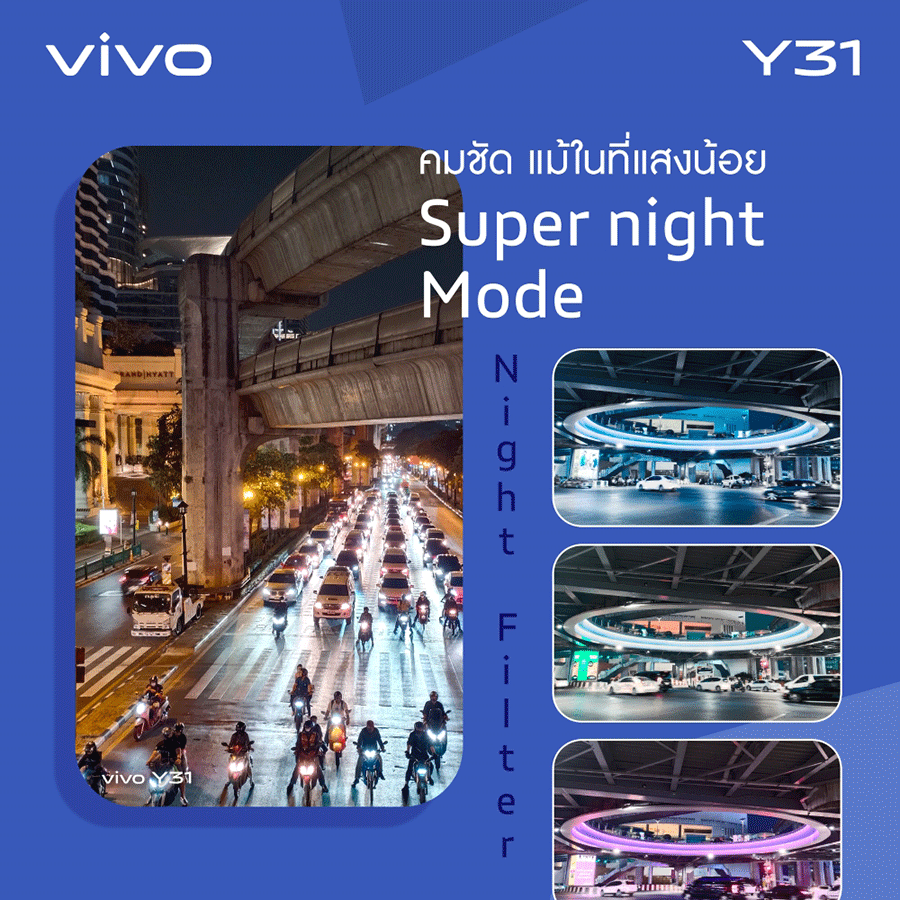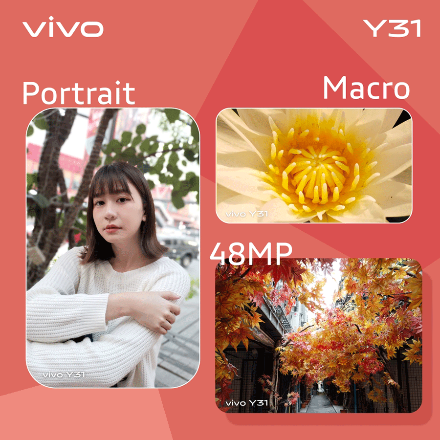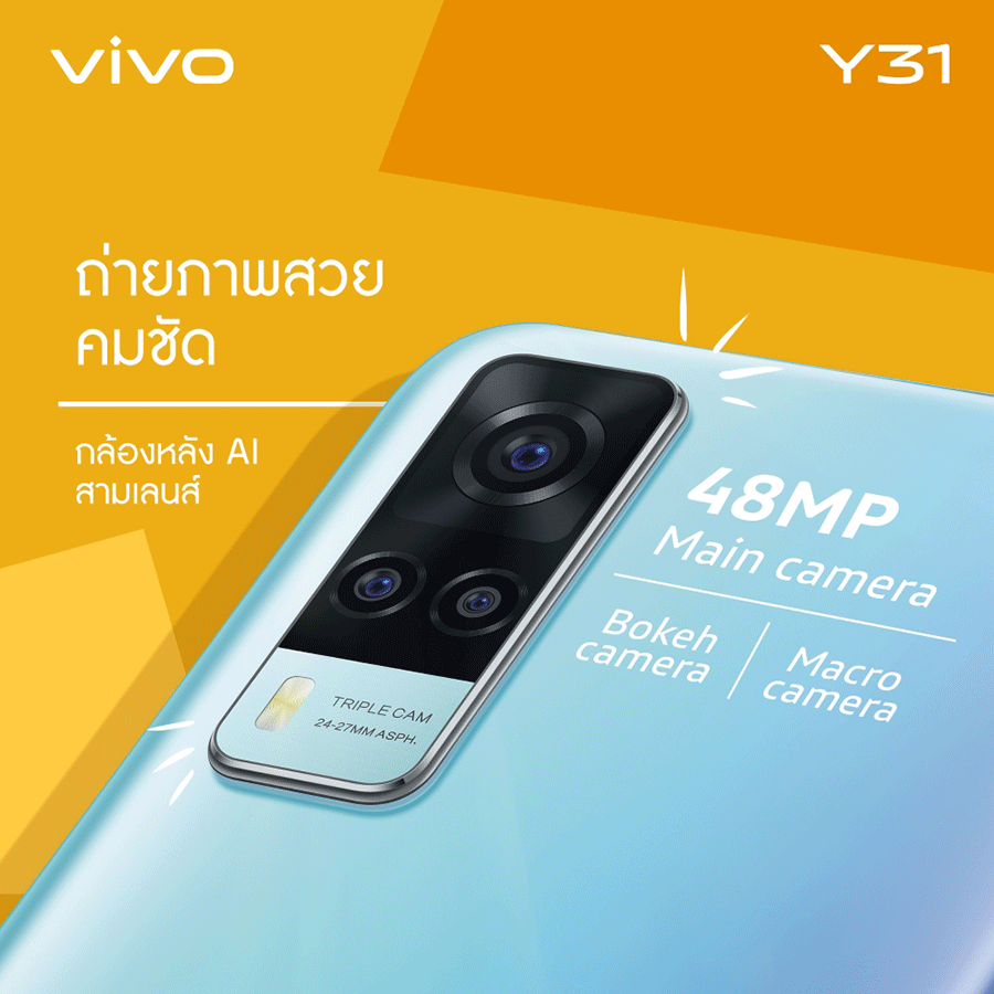 Vivo Y31 มาพร้อมกับกล้องหลัง AI คุณภาพถึง 3 ตัว ทั้งเลนส์กล้องหลัก 48 ล้านพิกเซล และ กล้องหน้า 8 ล้านพิกเซล ให้ภาพเซลฟีสวยเป็นธรรมชาติ รวมทั้งกล้องเลนส์โบเก้ (Bokeh) และกล้องเลนส์ Super Macro ที่พร้อมให้คุณเลือกเก็บความทรงจำได้ในหลายรูปแบบ มอบโอกาสให้คุณสามารถเลือกถ่ายภาพได้ในแบบที่ถูกใจ