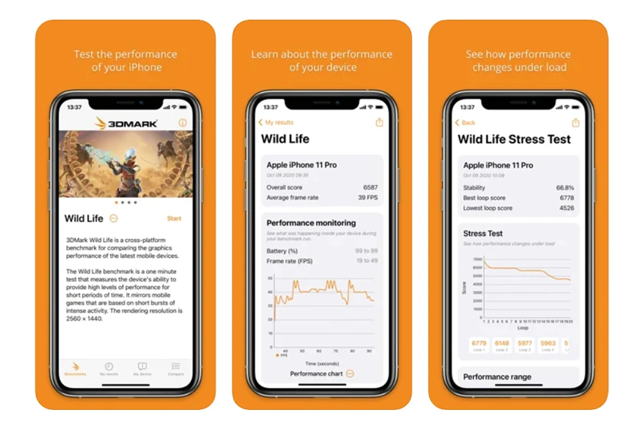 3DMark Wild Life Benchmark เป็นแอปพลิเคชัน Benchmark ยอดนิยมอีกหนึ่งแอปฯ ที่มีไว้สำหรับทดสอบประสิทธิภาพการทำงานของตัวเครื่อง โดยจะเน้นที่การทดสอบประสิทธิภาพการประมวลผลทางด้านกราฟิกเป็นหลัก เมื่อเข้าสู่แอปพลิเคชันจะมีให้เลือก 2 โหมดการทดสอบ คือ การทดสอบแบบรวดเร็ว (Quick Benchmark) และการทดสอบความถึกทนของอุปกรณ์ เมื่อเครื่องต้องอยู่ในสภาวะที่ทำงานหนักเป็นเวลานาน (Stress Test) สามารถใช้งานได้ทั้ง iPhone, iPad, iPod touch และ mac