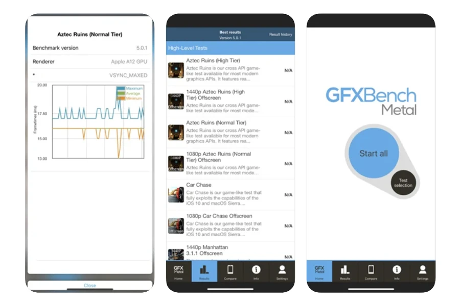 GFXBench Metal แอปพลิเคชันทดสอบปะสิทธิภาพการประมวลผลของอุปกรณ์ ที่มีจุดเด่นในเรื่องของการประมวลผลด้านกราฟิก ที่ครอบคลุมทั้งการวัดความเสถียรของกราฟิกเมื่อมีการใช้งานบนตัวเครื่องเป็นเวลานาน คุณภาพการประมวลผลภาพและแบตเตอรี่ โดย GFXBench จะมีรูปแบบการทดสอบที่หลากหลาย เพื่อที่จะรีดพลังประมวลผล แล้ววัดค่าข้อมูลสำหรับวิเคราะห์ความสามารถของตัวเครื่อง
