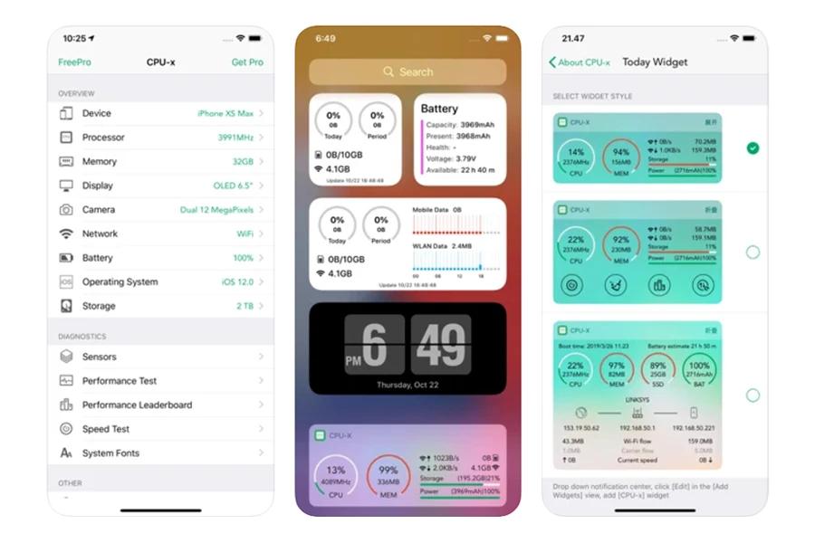 CPU-x หรือ CPU-x Dasher z Battery life เป็นแอปพลิเคชั่นที่สามารถสืบค้นข้อมูลฮาร์ดแวร์และระบบของโทรศัพท์มือถือได้ โดยเราสามารถเลือกดูข้อมูลสเปกต่าง ๆ ของตัวเครื่องของเราได้อย่างละเอียด เช่น ข้อมูลฮาร์ดแวร์ ระบบข้อมูล ระบบปฏิบัติการ, ข้อมูลเครือข่ายและผู้ให้บริการ, ความเร็วเครือข่ายแบบเรียลไทม์และข้อมูล Wi-Fi Hotspot, รายละเอียดบนหน้าจอโทรศัพท์, รายละเอียดกล้อง, หน่วยความจำและข้อมูลการใช้ที่เก็บข้อมูล และอื่น ๆ