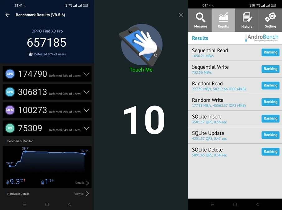 • ทดสอบด้วยแอปพลิเคชัน AndroBench ทำความเร็ว Storage ในการอ่านอยู่ที่ 1656.21 MB/s และการเขียน 732.56 MB/s (UFS 3.1)
