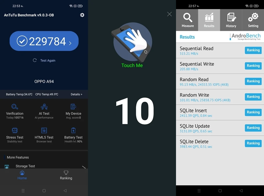 - ทดสอบด้วยแอปพลิเคชัน AndroBench ทำความเร็ว Storage ในการอ่านอยู่ที่ 515.21 MB/s และการเขียน 205.88 MB/s