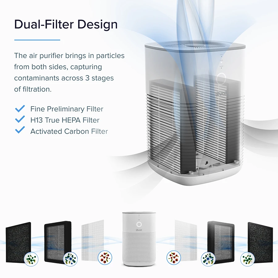 - Dual-True HEPA ระบบตัวกรอง True HEPA แบบคู่ โดยมาพร้อมไส้กรองอากาศ 3 ชั้น ประกอบด้วย Pre-Filter, H13 True HEPA Filter และ Activated Carbon Filter