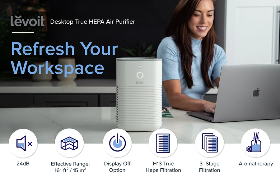 การมีเครื่องฟอกอากาศที่ดี มีดีมากกว่าที่คิด ในยุคที่ฝุ่นละออง PM 2.5 มีสิ่งแปลกปลอมและสิ่งสกปรกปกคลุมเต็มเมืองแบบนี้ มารับมือด้วยเครื่องฟอกอากาศ Levoit Desktop True HEPA ที่พร้อมมอบอากาศบริสุทธิ์ด้วยการกรองแบบ 3 ขั้นตอน และยังสามารถสร้างบรรยากาศความสดชื่นด้วยกลิ่นหอมที่คุณชื่นชอบได้อีกด้วย