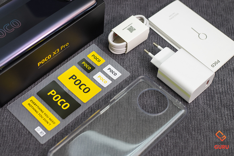 POCO X3 Pro มาในกล่องสีดำตัดด้วยตัวหนังสือสีเหลืองที่เป็นเอกลักษณ์ของทางโพโค โดยอุปกรณ์ภายในกล่องจะประกอบไปด้วย