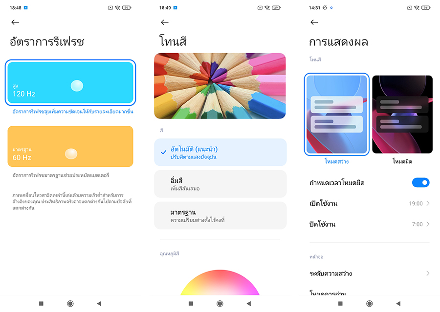 หน้าจอมีการใช้ DynamicSwitch เพื่อปรับอัตราการรีเฟรชให้เหมาะสมที่สุดสำหรับแอปพลิเคชันต่าง ๆ ในส่วนของความลื่นไหลและความรวดเร็วของการตอบสนองมาตราฐานที่ 60 Hz ถือว่าทำได้ดีค่ะ อาจมีการทัชแล้วหนืดอยู่บ้าง แต่เมื่อลองตั้งค่าอัตราการรีเฟรชเป็น 120Hz จะเห็นความต่างที่ชัดเจนเลยทันทีว่าสามารถทำงานได้รวดเร็วและลื่นไหลกว่ามากเป็นเท่าตัวจริง ๆ ซึ่งเราก็สามารถเลือกตั้งค่าได้ค่ะว่าจะใช้อัตราการรีเฟรชที่เท่าไหร่ตามความสะดวกและการใช้งาน ซึ่งนอกจากอัตราการรีเฟรช (Refresh Rate) แล้ว ยังสามารถตั้งค่าโทนสีและโหมดต่าง ๆ ได้อีกหลากหลาย ทั้งโหมดมืด (Dark mode) และโหมดการอ่าน (Reading Mode)