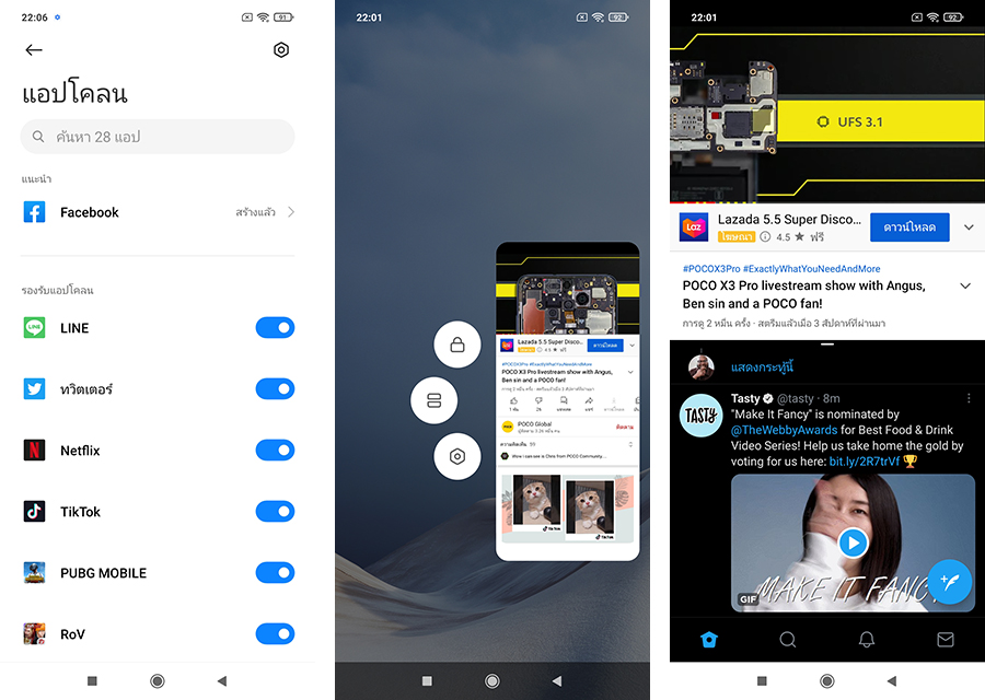 POCO X3 Pro รองรับฟีเจอร์โคลนแอปพลิเคชัน นั่นคือสามารถใช้งานแอปพลิเคชันได้ 2 แอปฯ พร้อมกัน ซึ่งรองรับแอปพลิเคชั่นโซเชียลหลัก ๆ ได้เกือบทั้งหมดเลย ไม่ว่าจะเป็น Line, Facebook, Messenger, Twitter และ Netflix การใช้งาน App Split-Screen หรือการใช้งาน 2 หน้าต่างก็สามารถทำงานได้ลื่นไหลทั้งสองแอปฯ ไม่มีปัญหาเลยค่ะ