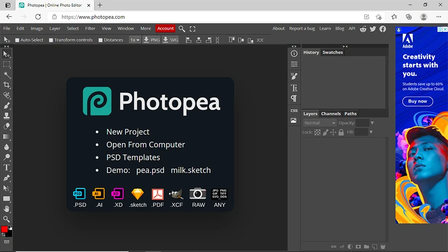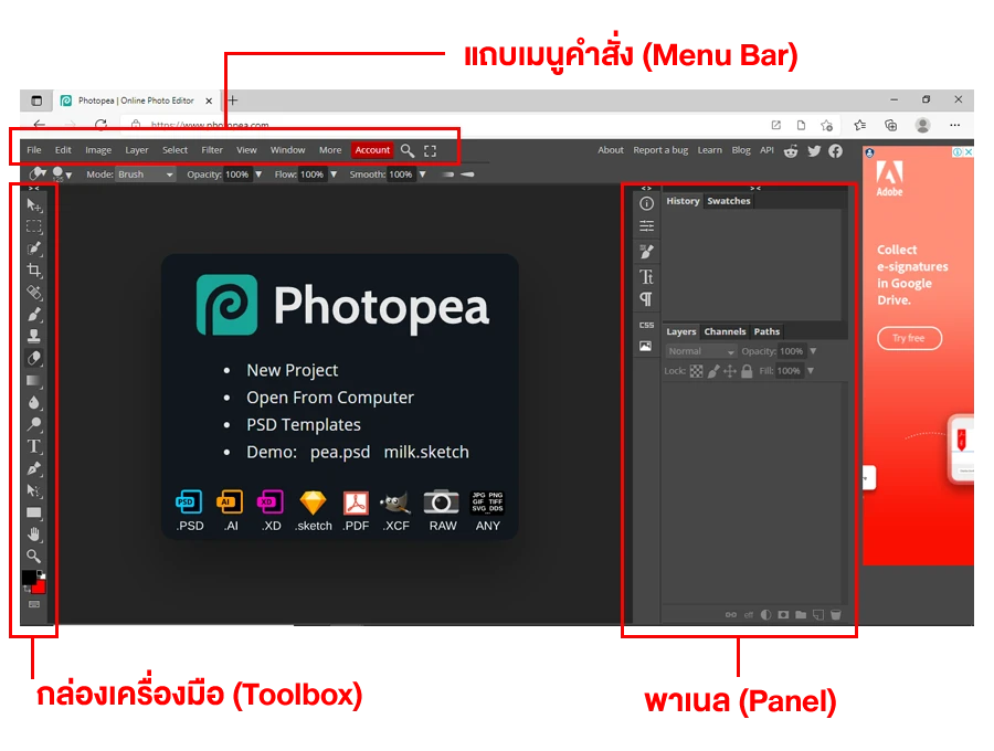 ทำความรู้จัก PhotopeaPhotopea เป็นเว็บแต่งรูปออนไลน์ที่พัฒนาขึ้นโดย Ivan Kutskir โปรแกรมเมอร์ชาวสาธารณรัฐเช็กเพียงคนเดียว ไม่เชื่อก็ต้องเชื่อ เก่งอะไรเบอร์นั้น! ซึ่งจริงๆ เว็บนี้เริ่มฮอตฮิตติดลมบนและมีคนนำเอามารีวิวการใช้งานให้เห็นกันมาตั้งแต่เมื่อช่วง 2-3 ปีที่ผ่านมาแล้วค่ะ และจนถึงตอนนี้ก็ยังคงได้รับความนิยมและเปิดให้บริการอยู่ จึงถือโอกาสนี้นำมาปัดฝุ่นใหม่ให้สำหรับคนที่ยังไม่รู้จัก หรือคนที่ต้องการใช้งานแต่งรูป รีทัชรูป หรือแก้ไข Artwork อย่างเร่งด่วน แต่ดันติดอยู่ในสถานการณ์ที่ไม่มี Photoshop หรือโปรแกรมแต่งภาพอื่น ๆ ใช้มาฝากกัน เพียงแค่เรายังเชื่อมต่ออินเทอร์เน็ตได้ ก็สามารถใช้งานผ่านเว็บเบราว์เซอร์ได้เลยทันทีค่ะ