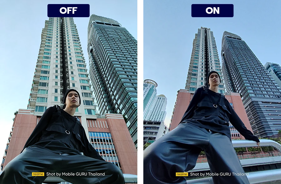 กล้องหลัง สมาร์ตโฟน realme GT 5G มาพร้อมกล้องหลัง Sony 64MP Triple Camera ประกอบด้วย เลนส์หลัก Sony IMX682 ความละเอียด 64 ล้านพิกเซล ค่ารูรับแสงกว้าง f/1.8, เลนส์ Ultra Wide-angle มุมกว้าง 119 องศา ความละเอียด 8 ล้านพิกเซล ค่ารูรับแสงกว้าง f/2.3 และเลนส์ Macro ความละเอียด 2 ล้านพิกเซล ระยะโฟกัสใกล้สุด 4 เซนติเมตร ค่ารูรับแสงกว้าง f/2.4 มาพร้อมกับไฟแฟลช LED ในตัว รองรับซูมดิจิตอลสูงสุด 10X รองรับการบันทึกวิดีโอความละเอียดสูงสุด 4K และมีกันสั่น UIS Max พร้อมด้วยโหมดถ่ายภาพ 64MP Mode, Super Night Mode, Panoramic View, Expert, Timelapse, Bokeh, HDR, Ultra Wide-angle, Ultra Macro, AI Scene Recognition, AI Beauty, Filter, Dazzle Color Mode, Hypertext, AI ID photo, Portrait Distortion Correction ซึ่งแม้ว่าจะไม่ได้ชูมาเป็นจุดขายหลักของรุ่นนี้ แต่ผลลัพธ์ที่ออกมาก็ถือว่าอยู่ในเกณฑ์ระดับดี และมีฟีเจอร์ให้เลือกสนุกไปกับการกดชัตเตอร์หลากหลายแบบค่ะ