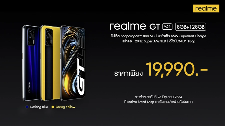 realme ประเทศไทย วางจำหน่าย realme GT 5G "เรือธงเร็วแรงเต็มสปีด" ใน 2 ตัวเลือกสี ได้แก่ สีน้ำเงิน Dashing Blue และสีเหลือง Racing Yellow พร้อมตัวเลือกความจำ RAM 8GB + ROM 128GB เพียงรุ่นเดียว ในราคา 19,990 บาท สามารถจับจองเป็นเจ้าของได้ตั้งแต่วันที่ 26 มิถุนายน 2564 เป็นต้นไป ที่ realme Brand Shop ทุกสาขา, Banana, BKK , Cyborg Kong , TGfone , Jaymart, CSC, IT City, Powerbuy และร้านค้าตัวแทนจำหน่ายทั่วประเทศ รวมไปถึงช่องทางออนไลน์ Shopee, Lazada, Thisshop และ JD Central พร้อมสิทธิผ่อน 0% นานสูงสุด 24 เดือน ผ่านบัตรเครดิตและธนาคารที่ร่วมรายการ