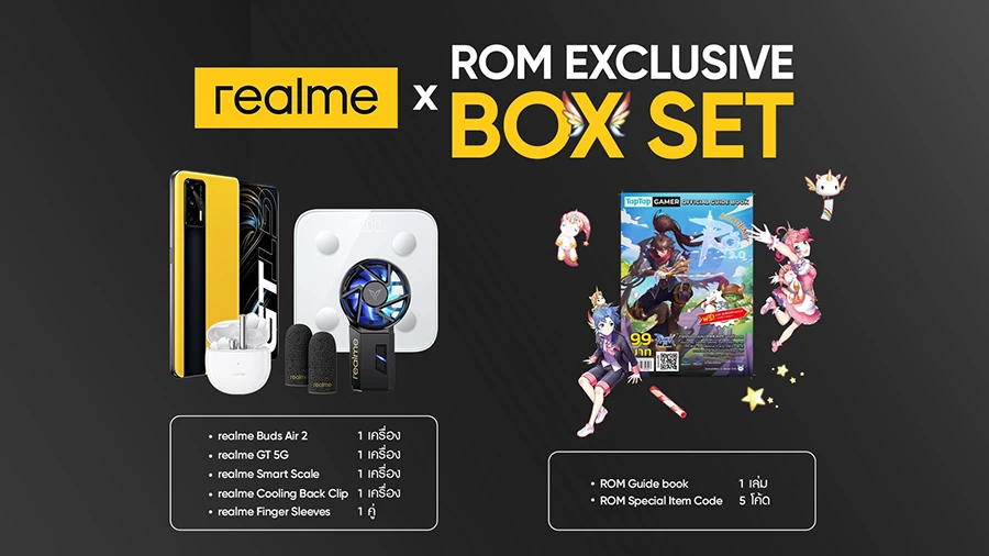 นอกจากนี้ ยังมี realme GT 5G Exclusive Box Set ที่ภายในกล่องจะมีสมาร์ตโฟน realme GT 5G ใหม่ล่าสุด และของที่ระลึกพิเศษจาก realme แบบจุใจ พร้อมไอเทมพิเศษในเซ็ต Wonderland Fantasy ประกอบด้วย อุปกรณ์สำหรับสวมใส่ตัวละครทั้งหมด 5 ชิ้น รวมถึงหนังสือคู่มือเล่มแรกสำหรับเกม Ragnarok M พิมพ์ 4 สีทั้งเล่ม ในราคา 25,999 บาท โดยจะเปิด Pre-order ให้เกมเมอร์เป็นเจ้าของก่อนใครแล้ววันนี้ - 2 กรกฎาคม 2564 และจะเริ่มวางจำหน่ายพร้อมกันทั่วประเทศ ในวันที่ 3 กรกฎาคม เฉพาะที่ realme Brand Shop เท่านั้น!