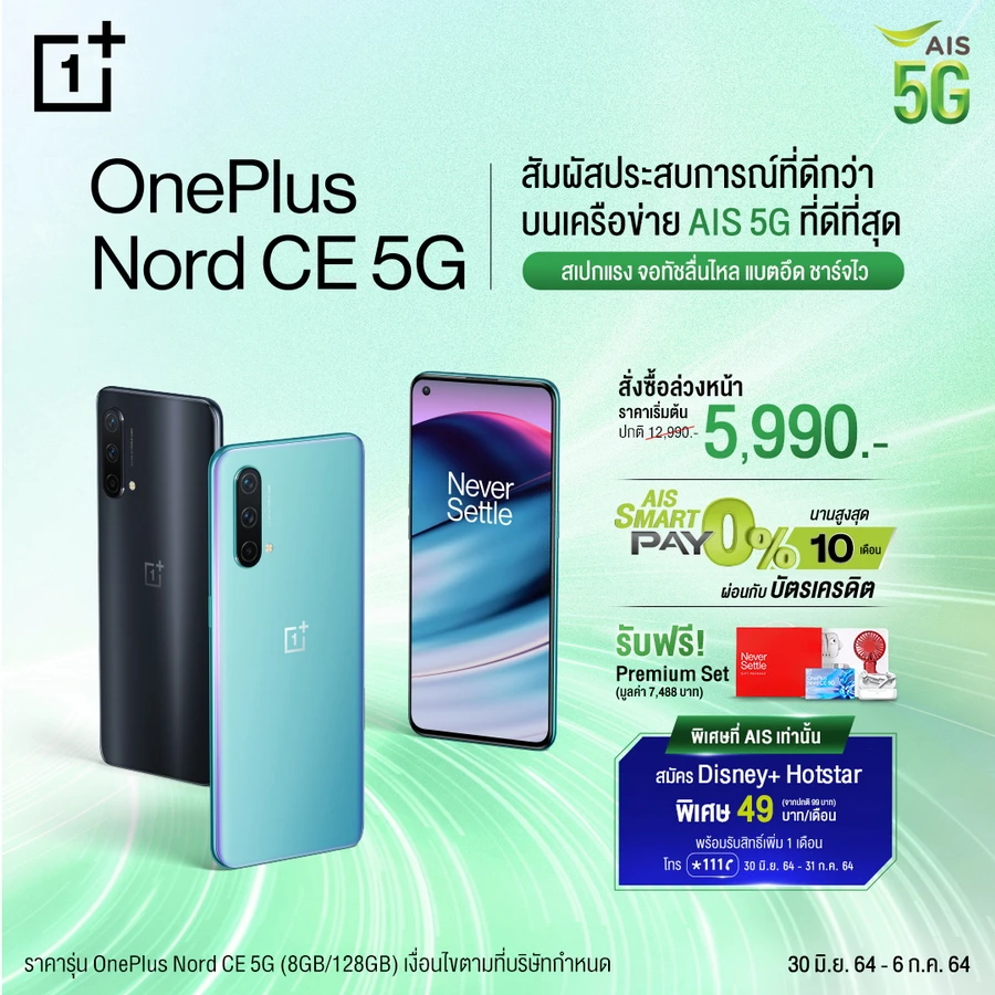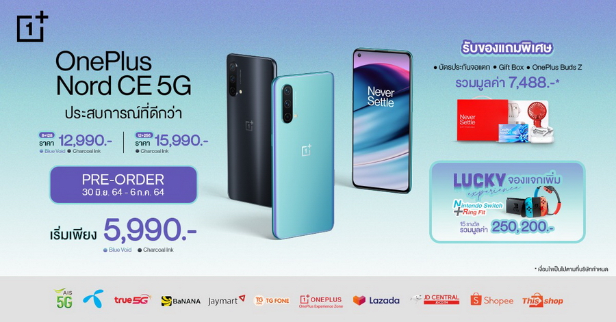 สำหรับในประเทศไทย OnePlus Nord CE 5G จะมีเข้ามาวางจำหน่าย 2 ความจุครับ ได้แก่ ความจุ 8/128 ราคา 12,990 บาท มีให้เลือก 2 สี Blue Void และ Charcoal Ink ส่วนความจุ 12/256 ราคา 15,990 บาท จะมีเฉพาะสี Charcoal Ink พิเศษราคาเริ่มต้นจาก AIS เพียง 5,990 บาท วันนี้ - 6 ก.ค. 64 เท่านั้น!