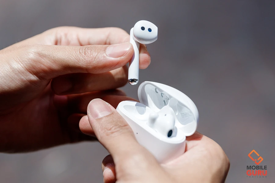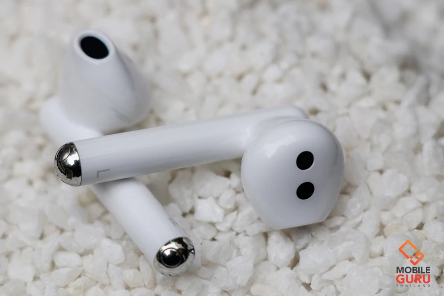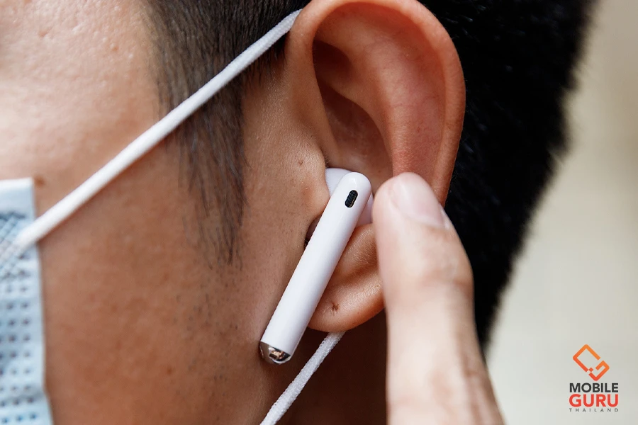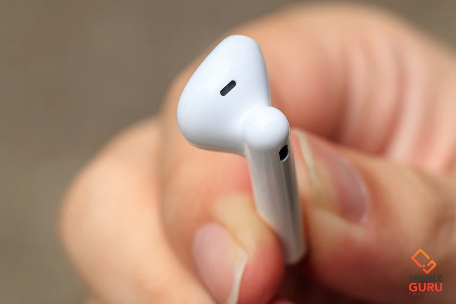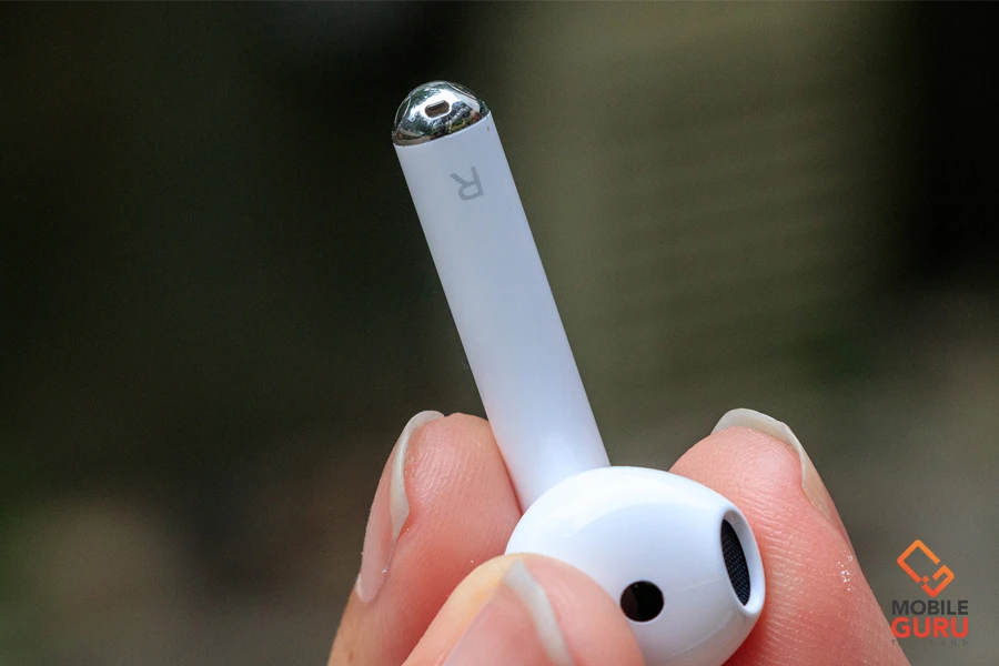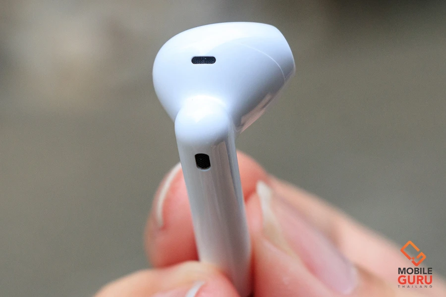 ส่วนด้านล่างของก้านหูฟัง จะเป็นตำแหน่งของไมค์สำหรับตรวจจับเสียงสนทนา