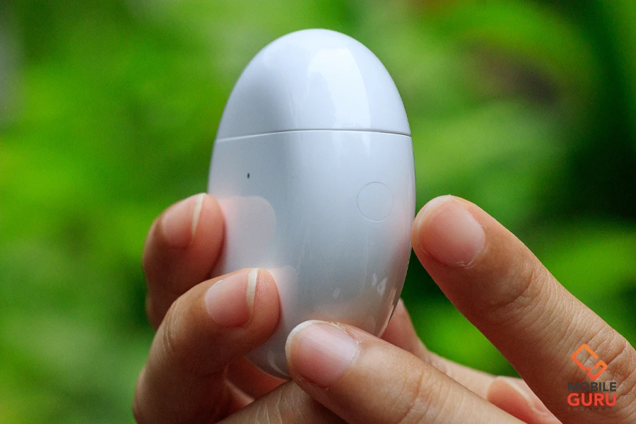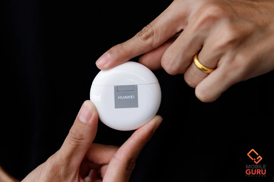 มากันที่ตลับชาร์จของหูฟังกันบ้าง รอบนี้ทางหัวเว่ยยังคงออกแบบตัวตลับชาร์จให้เป็นรูปทรงวงรี ด้านหน้ามีไฟแสดงสถานะ ส่วนด้านหลังมีโลโก้ของหัวเว่ยแปะมาด้วย เป็นดีไซน์ที่มีหลายคนบ่นเหมือนกันว่าสับสนตอนใช้งานแรก ๆ เพราะจะไปพยายามเปิดฝาที่ตำแหน่งของโลโก้หัวเว่ยแทน