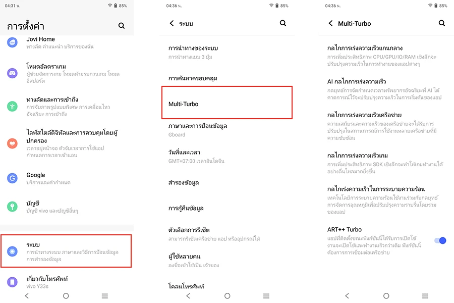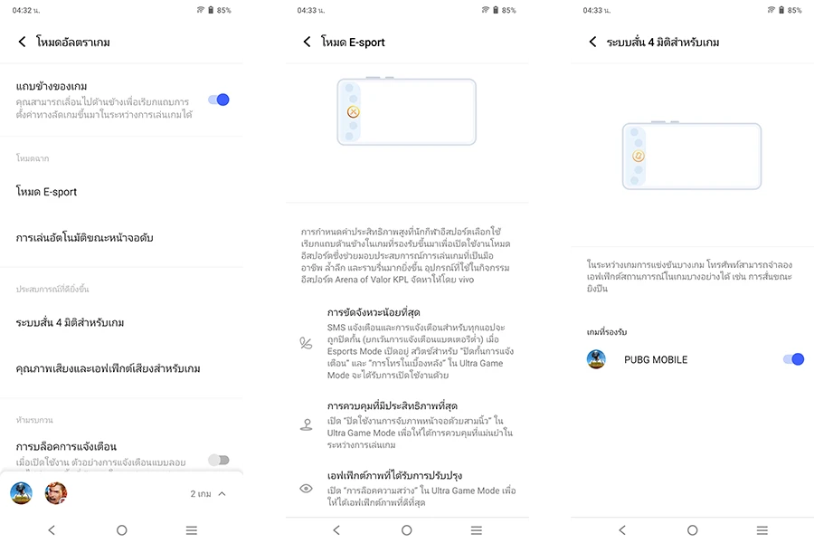 vivo Y33s มาพร้อมกับระบบผู้ช่วยจัดการเกม Ultra Game Mode ฟีเจอร์สำหรับเกมเมอร์ที่จะช่วยเร่งประสิทธิภาพในการเล่นเกมให้ดีขึ้น โดยสามารถเลือกจัดการได้ตามต้องการ ทั้งการเปิดโหมด E-sport, การแสดงภาพซ้อนภาพของเกม -Game Picture-in-Picture, การปิดกั้นการแจ้งเตือนและการรบกวนต่าง ๆ ในระหว่างเล่นเกม - Do Not Disturb, ระบบสั่น 4 มิติสำหรับเกม - 4D Game Vibration (ใช้ได้เฉพาะกับ PUBG เท่านั้น) และฟีเจอร์อื่น ๆ ที่จะช่วยอำนวยความสะดวกให้การเล่นเกมเป็นไปอย่างเต็มอรรถรสมากที่สุด ร่วมกับ Multi-Turbo 5.0 ที่คอยช่วยรีดประสิทธิภาพการเล่นเกม พร้อมทั้งจัดการด้านการประหยัดพลังงาน และการระบายความร้อนตัวเครื่องให้เย็นลงเร็วขึ้น ช่วยลดปัญหาต่าง ๆ ที่อาจเกิดขึ้นในระหว่างเล่นเกมได้ดีกว่าที่คิดไว้