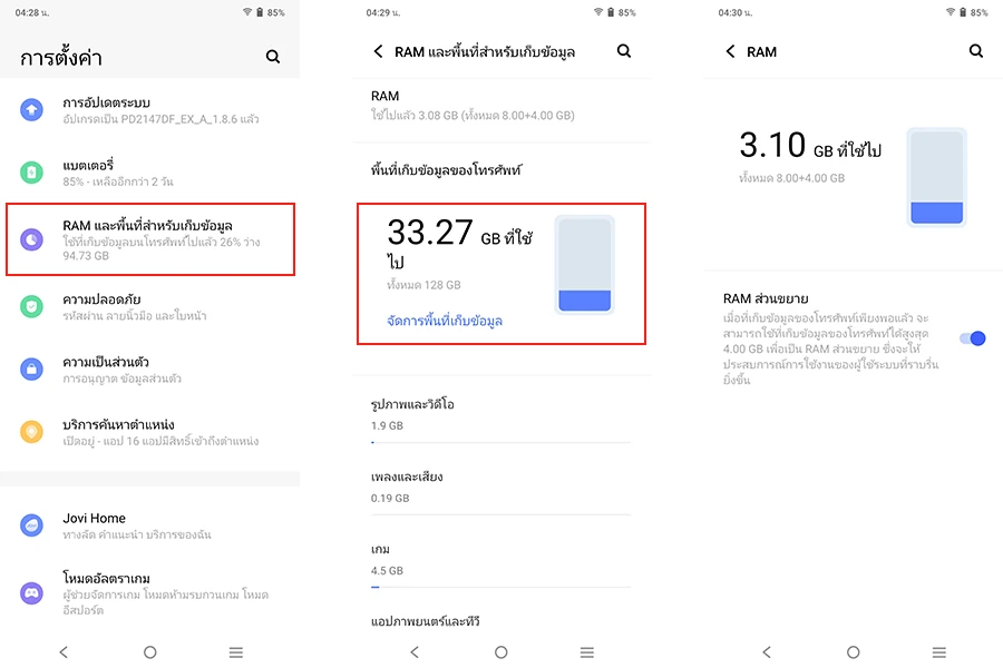 ฟังก์ชันการใช้งานต่าง ๆ ที่จำเป็นมีมาให้ครบ การใช้งานโดยรวมไม่หน่วง ไม่ค้าง เปิดรันหลายแอปฯ พร้อมกันได้ไม่ติดขัด เครื่องไม่เร็ว ด้วย RAM ที่ใส่มาให้ถึง 8GB พ่วงด้วยการเปิดใช้ Extended RAM รวมไปถึง Multi-Turbo ทำให้สามารถจัดการกับการใช้ทรัพยากรต่าง ๆ บนตัวเครื่องได้ดีขึ้น การเล่นเกมอย่างพวก RoV, Call of Duty, PubG, Free Fire เล่นได้ลื่น ใครเป็นสายเกมแนวนี้ รุ่นนี้คือตอบโจทย์ค่ะ แต่สำหรับสายเกมจริงจัง กราฟิกแน่น ภาพสวย เน้นเล่นยาว ๆ อย่าง Genshin Impact, RoX, ROM เกมเมอร์สายนี้ ขยับไปรุ่นที่สูงขึ้นน่าจะเล่นมันส์กว่า
