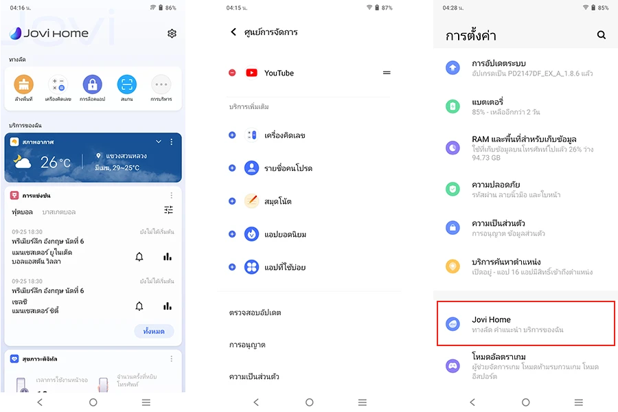 ระบบผู้ช่วยอัจฉริยะ Jovi รวบรวมทางลัดการเรียกใช้งานแอปพลิเคชั่น, ข้อมูลสภาพอากาศ การออกกำลังกาย และการแจ้งเตือนต่าง ๆ เอาไว้ในหน้าเดียวกัน โดยสามารถเรียกใช้งานได้จากหน้า Home แค่ปัดซ้ายสุด หรือลากแถบการแจ้งเตือนลงมาจากด้านบน หรือจะเปิดจากหน้า Setting ก็ได้