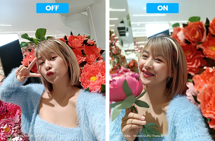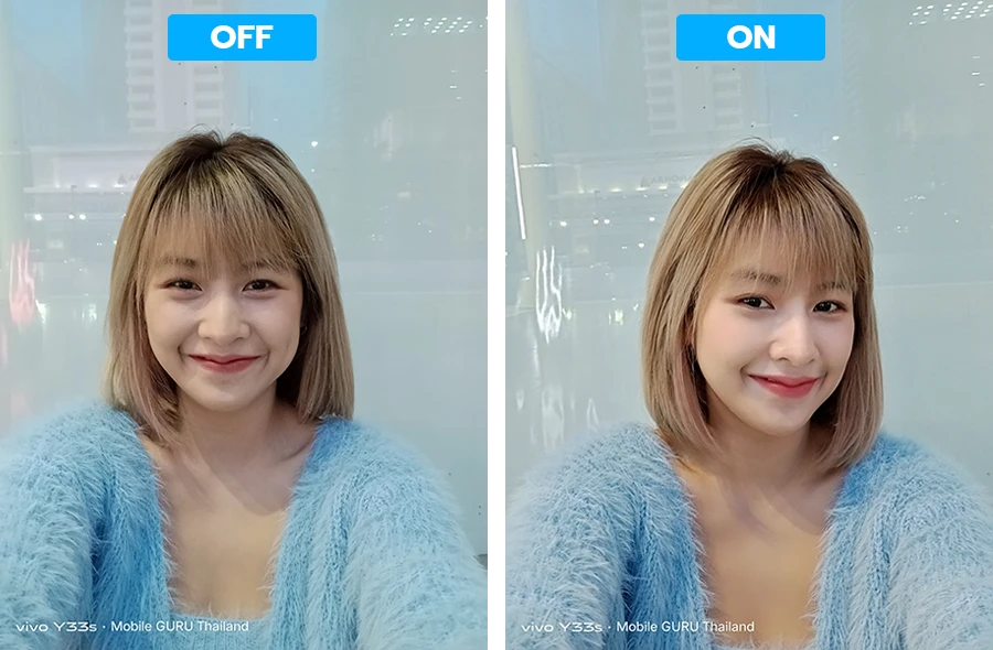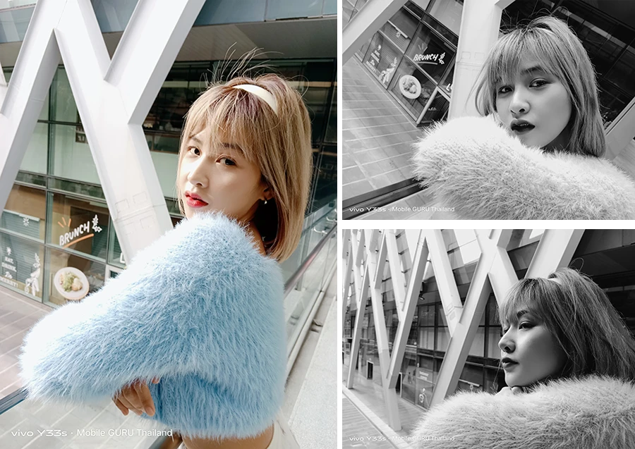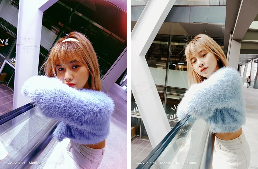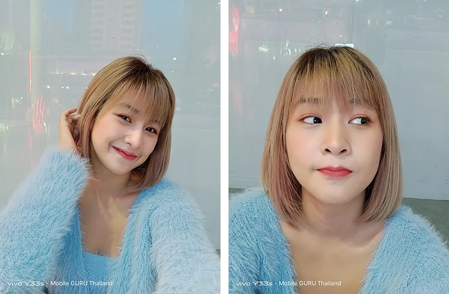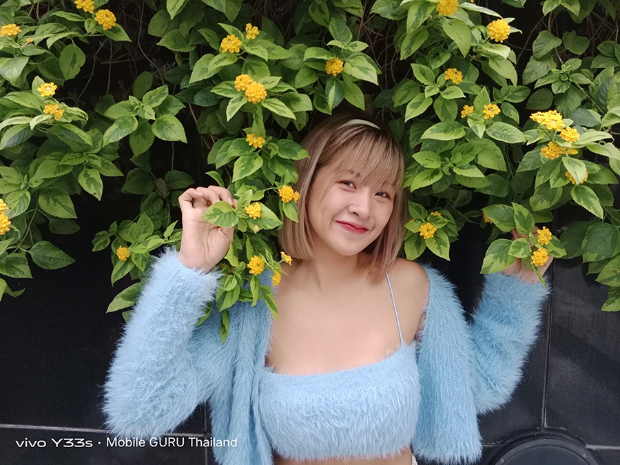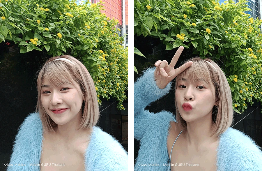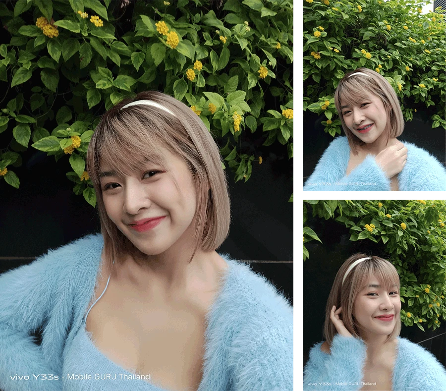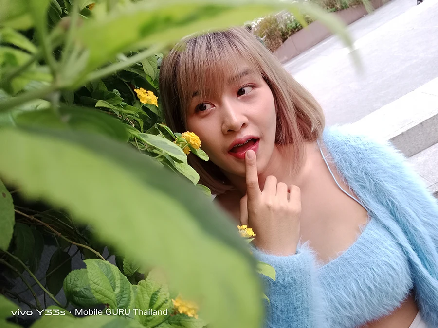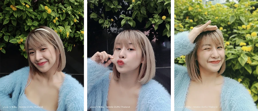 กล้องหน้า ของ vivo Y33s มาพร้อมกับเลนส์ความละเอียด 16 ล้านพิกเซล ค่ารูรับแสงกว้าง f/2.0 รองรับ Face Beauty ปรับแต่งใบหน้าให้สวยเนียนเป็นธรรมชาติ พร้อม Bokeh Mode ถ่ายเซลฟี่แบบละลายฉากหลัง ทำให้ภาพดูมีมิติขึ้น เก็บขอบและละลายฉากหลังได้ดีระดับหนึ่ง มีขาดมีเกินบ้างเล็กน้อย แต่สาว ๆ น่าจะชอบกันค่ะ และยังมี Multi-Style Portrait เลือกถ่ายเซลฟี่ให้เหมาะสมกับสไตล์ของตัวเอง นอกจากนี้ ยังสามารถเปิดโหมด Super Night Selfie สำหรับถ่ายเซลฟี่ในที่แสงน้อยหรือถ่ายตอนกลางคืนได้ หรือจะเลือกเซลฟี่แบบเปิด Smart Screen Flash เพิ่มไฟ เสริมให้ใบหน้าสว่างและโดนเด่นขึ้นได้อีกด้วย