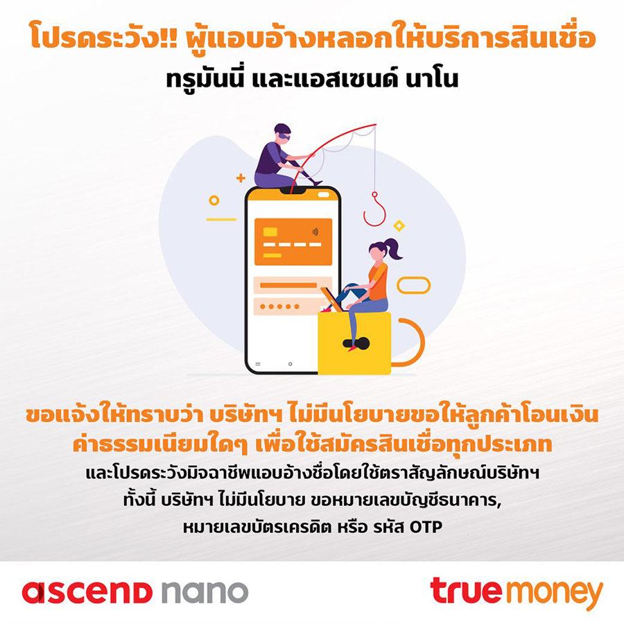 สุดท้ายนี้ ทรูมันนี่ ขอย้ำเตือนให้ผู้ใช้ระมัดระวังผู้แอบอ้างหลอกให้บริการสินเชื่อ โดยใช้ชื่อ ทรูมันนี่ หรือ แอสเซนด์ นาโน และขอแจ้งให้ทราบว่า บริษัทฯ ไม่มีนโยบายขอให้ลูกค้าโอนเงินค่าธรรมเนียมใด ๆ เพื่อสมัครสินเชื่อทุกประเภท รวมถึงการขอหมายเลขบัญชีธนาคาร หมายเลขบัตรเครดิต หรือรหัส OTP หากลูกค้าท่านใดพบการกระทำดังกล่าวที่แอบอ้างตราสัญลักษณ์หรือเครื่องหมายการค้าหรือข้อความที่เกี่ยวข้องกับชื่อแบรนด์ TrueMoney โปรดแจ้งได้ที่ Call Center เบอร์ 1240 บริษัทจะดำเนินการตรวจสอบและดำเนินตามขั้นตอนทางกฎหมายต่อไป