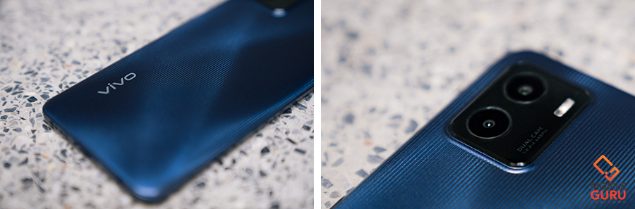 ตัวฝาหลังดูด้วยตาจะให้สีออกน้ำเงินไปทางครามมีประกายมุกจาง ๆ ออกแบบเป็นลายคลื่นเวลาเล่นกับแสงค่อนข้างสวย ฝาหลังมีผิวสัมผัสเรียบ วัสดุเป็นเนื้อด้าน ทำให้ไม่ติดลายนิ้วมือเลยแม้แต่น้อย ถือเป็นข้อดีอย่างหนึ่งเลยค่ะ ตัวกล้องหลังคู่ AI พร้อมแฟลชถูกวางไว้ด้านบนเยื่องไปทางซ้าย บนฐานกล้องที่นูนออกมาเพียงเล็กน้อย ใส่เคสที่แถมมาด้วยก็คลุมปิดไปพอดีค่ะ