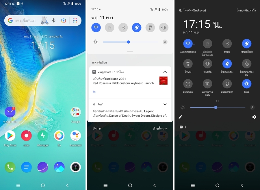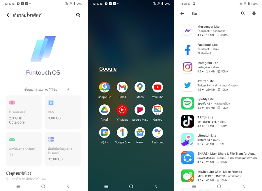vivo Y15s ทำงานบน Android 11 (Go Edition) ครอบทับด้วย Funtouch OS 11.1 จึงได้เป็นหน้าตาอินเตอร์เฟสที่สวยงามสบายตาอย่างที่เราคุ้นเคยกันดีบนสมาร์ตโฟนวีโว่ ซึ่งก็ให้การทัชได้ลื่นไหลกลาง ๆ ตามสเปคค่ะ นั่นคือไม่ได้ลื่นปรื้ดตามมือได้ดั่งใจแบบเรือธง มีหน่วงบ้างในบางจังหวะ แต่อยู่ในเกณฑ์ที่รับได้ไม่ได้กระทบการใช้งานมากค่ะ มีโหมดการแสดงผลใช้งานทั้งธีมมืด (Dark mode) และโหมดการป้องกันดวงตา (Blue Light Filter mode)