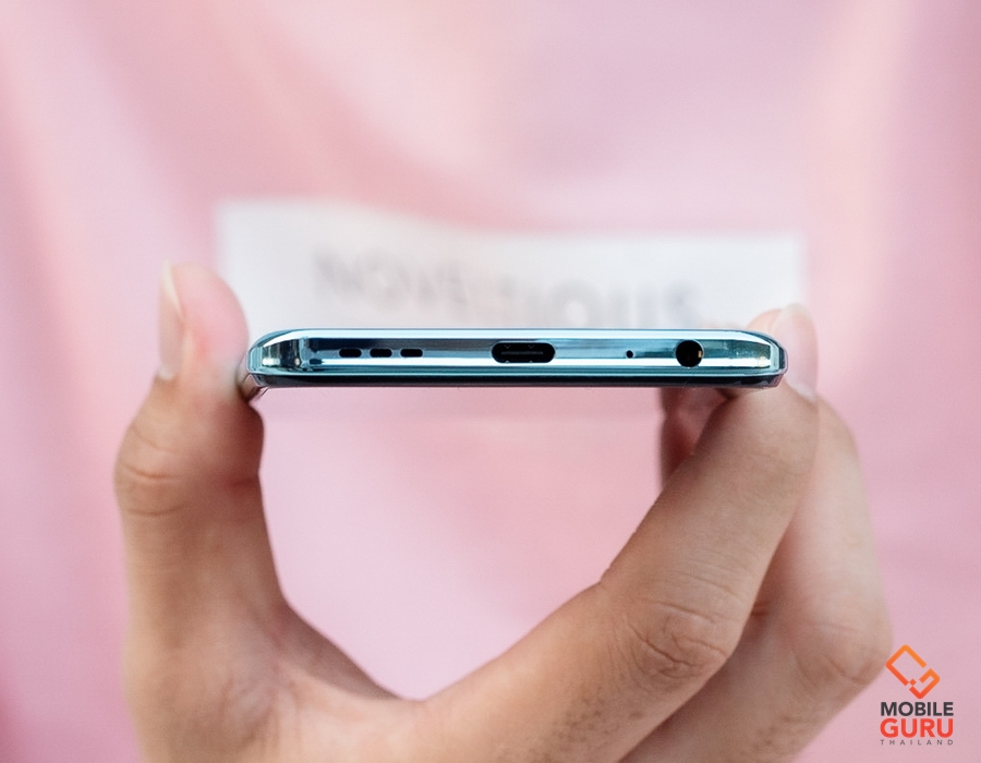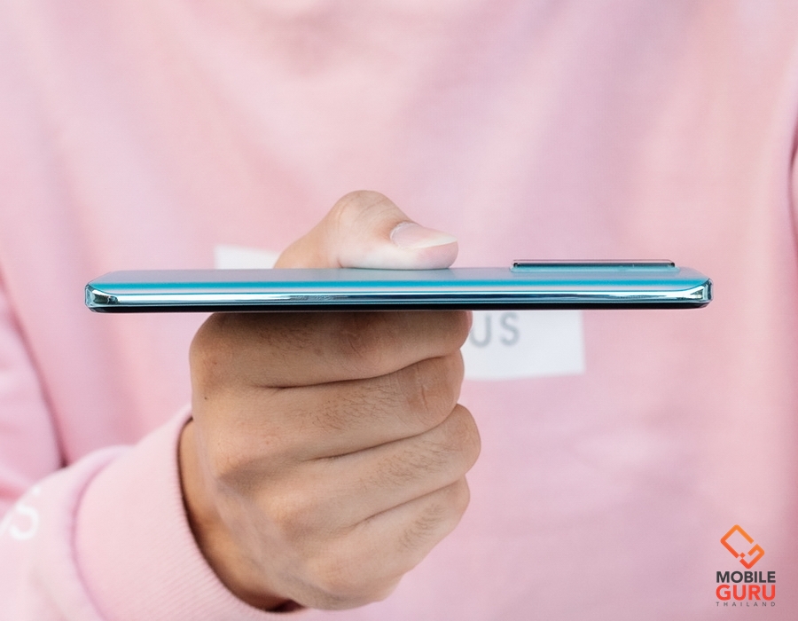 ขอบตัวเครื่องชุบโครเมี่ยมแวววาวสวยงาม ด้านบนประกอบด้วยไมค์ตัดเสียงรบกวนและช่องใส่ซิม, ด้านล่างมีพอร์ท USB Type-C, ไมโครโฟน ลำโพง และพอร์ทหูฟัง 3.5 มม., ด้านซ้ายเรียบๆ, ด้านขวาจะมีปุ่มปรับระดับเสียง และปุ่ม Power ซึ่งทำหน้าที่เป็นเซนเซอร์สแกนลายนิ้วมือ