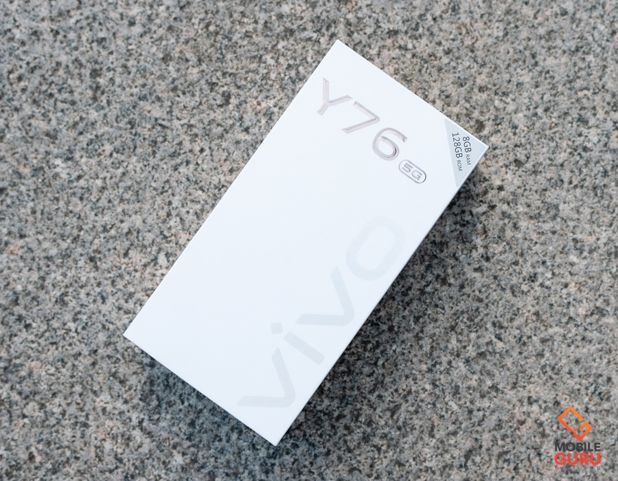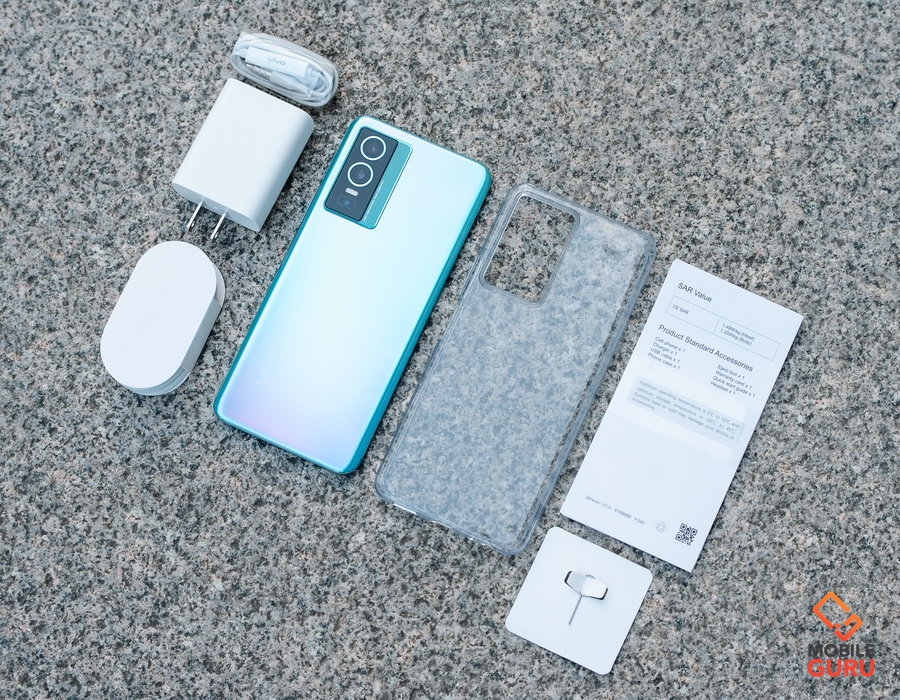 vivo Y76 5G ในกล่องจะมี ตัวเครื่อง, อะแดปเตอร์, สาย USB Type-C, หูฟังแบบ Earbud, เคสใส, เข็มจิ้มซิม และคู่มือ