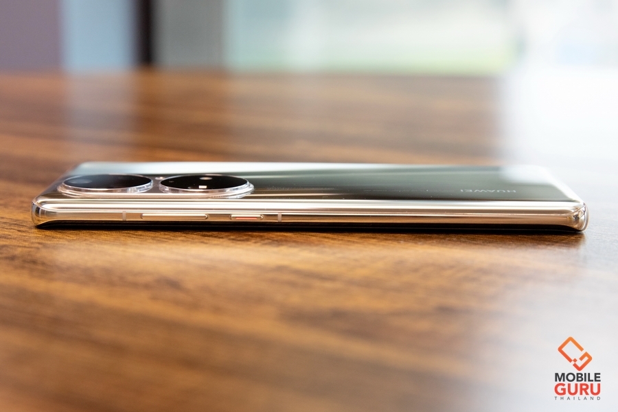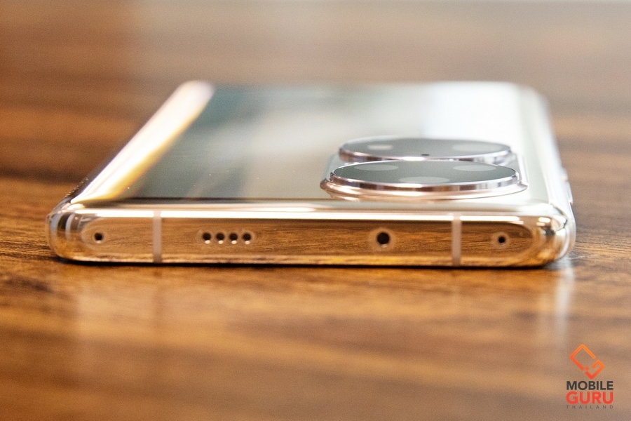 สำหรับเครื่องที่นำมารีวิวจะเป็นสีทอง Cocoa Gold ซึ่งจะเป็นสีทองจางๆครับ ดูจะออกเงินๆอมทองนวลๆมากกว่า ซึ่งผมว่าเป็นโทนสีที่สวยงามและดูหรูหรามากๆเลย ฝาหลังเป็นกระจกเงาวับ ถ้าไม่ใส่เคสผมว่าเช็ดกันทั้งวันเลยครับ (แต่สวยนะ) พร้อมการวางโลโก้ HUAWEI และ LEICA ได้อย่างเรียบหรู ชุดกล้องหลัง Dual-Matrix Camera Design ดูพิเศษและสะดุดตามากๆ ประกอบด้วยกล้องหลัง 4 เลนส์ Leica ความละเอียด 50MP F1.8, 23 มม. (wide), PDAF, Laser AF, OIS + 64MP F3.5, 90 มม. (periscope telephoto), PDAF, OIS, 3.5x optical zoom, 100x digital zoom + 13MP F2.2, 120 องศา, 13 มม. (ultrawide) + 40MP F1.6, 23 มม. (B/W) พร้อม dual-LED flash ที่วางตำแหน่งห่างกัน และมีไมค์อีก 1 ตัวอยู่บริเวณกล้องด้วย เรียกได้ว่าจัดเต็มเพื่อการถ่ายภาพเลยครับ และกล้องหลังบันทึกวิดีโอระดับ 4K 30/60fps, 1080p 30/60fps, 1080p 960fps, gyro-EIS