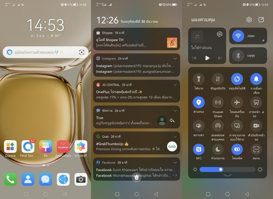HUAWEI P50 Pro ทำงานบน EMUI 12.0.1 การใช้งานปรับตั้งค่าทุกอย่างเหมือน Android ผู้ใช้ไม่ต้องปรับตัวอะไรเลยครับ จะรู้สึกแปลกซักหน่อยก็ตรงแบ่งการลากหน้าจอเป็น 2 ส่วน ด้านซ้ายเป็นการเปิดดูการแจ้งเตือน ส่วนด่านขวาจะเป็นในส่วนของ Quick Toggle ซึ่งใช้ไปไม่นานก็ชินครับ นอกนั้นโดยรวมก็เหมือนกันหมด สำหรับการดาวน์โหลดแอปพลิเคชั่นจะผ่านทาง HUAWEI AppGallery ซึ่งเป็นศูนย์รวมแอปพลิเคชั่นของทาง HUAWEI เอง ซึ่งในตอนนี้แอปจากรัฐบาลต่างๆที่เราจำเป็นต้องใช้อย่าง หมอพร้อม, เป๋าตังค์, ไทยชนะ มีให้ดาวน์โหลดครบเลย รวมทั้งแอปสถาบันการเงิน ธนาคารต่างๆ ก็มีให้ดาวน์โหลดเกือบครบเลยครับ อย่างผมใช้ SCB Easy ก็มีให้พร้อม รวมทั้งแอปสั่งอาหารต่างๆ ไม่ว่าจะเป็น Grab, Line Man และอื่นๆก็มีให้ดาวน์โหลดเกือบครบ แต่บางตัวอย่าง Foodpanda ก็ยังเป็น Quick App นะครับ รวมทั้งแอปพลิเคชั่นอื่นๆอีกหลายแอป ซึ่งมีทั้งที่ใช้งานได้อย่างสมบูรณ์ และที่ยังใช้งานได้ไม่เท่าแอปจริงๆ