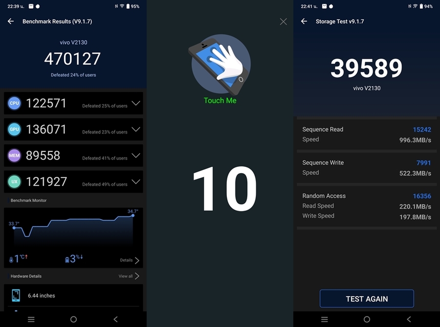 - ทดสอบความเร็ว Storage การอ่านอยู่ที่ 996.3 MB/s และการเขียน 522.3 MB/s (UFS 2.2)