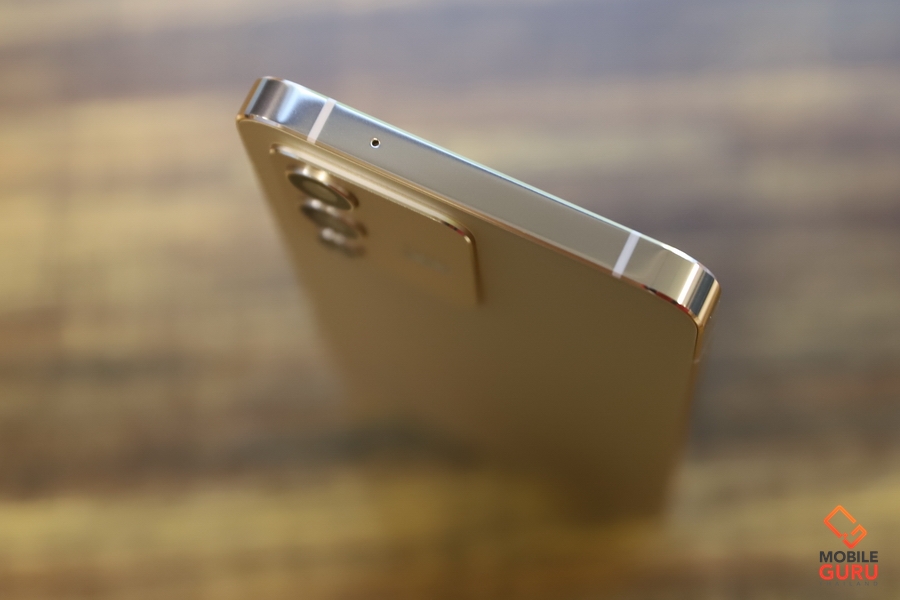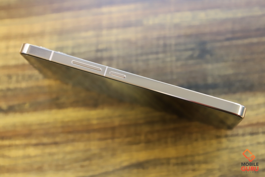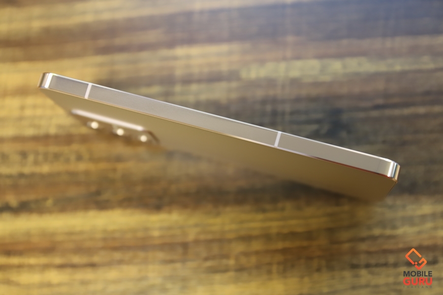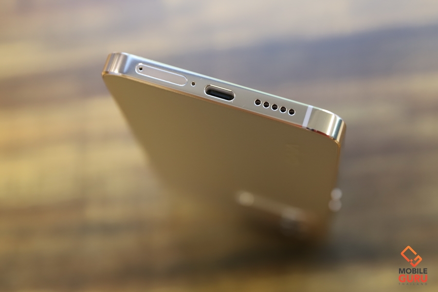 vivo V23 5G ขอบตัวเครื่องจะเป็นวัสดุโลหะสีทองมันเงา หรูหรามากๆเลยครับ มีแถบเสาอากาศโดยรอบ ด้านบนประกอบด้วยไมค์ตัดเสียงรบกวน, ด้านล่างมีพอร์ท USB Type-C, ไมโครโฟน และลำโพง (เสียงดังมากครับ), ช่องใส่ซิม, ด้านซ้ายเรียบๆ, ด้านขวาจะมีปุ่มปรับระดับเสียง และปุ่ม Power