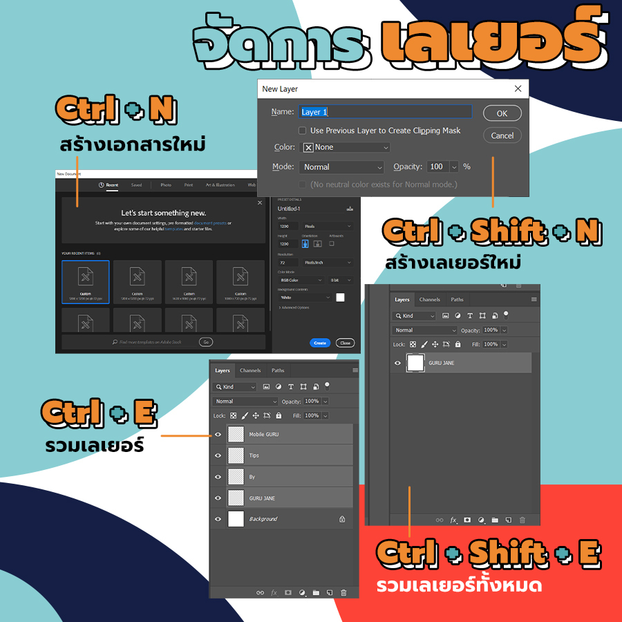 สิ่งสำคัญในการสร้างงานเพื่อไม่ให้ทับกับงานเดิมที่ทำอยู่ก็คือการทำงานบนเลเยอร์ที่แยกออกมาอีกที Ctrl + Shift + N จึงเป็นคีย์ลัดสำหรับสร้างเลเยอร์ใหม่ ที่ช่วยเซฟเวลาไปได้เยอะ