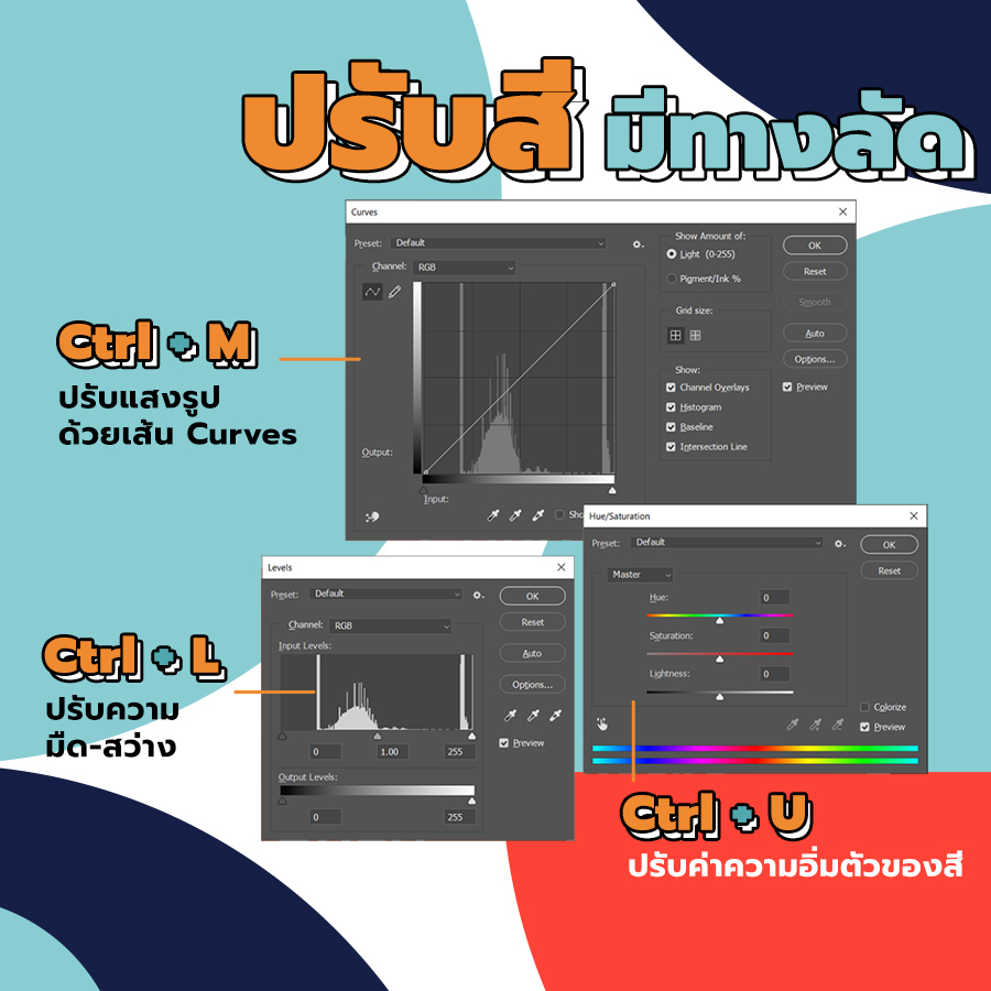 คีย์ลัด Ctrl + U เป็นอีกหนึ่งคีย์ลัดสำหรับการปรับแต่งสีและภาพที่สายแต่งภาพอย่างเราใช้กันเป็นประจำ ซึ่งจะเป็นการเรียกหน้าจอ Hue/Saturation ขึ้นมา เพื่อปรับเฉดสี ความสดปรับแสงมืด-สว่าง