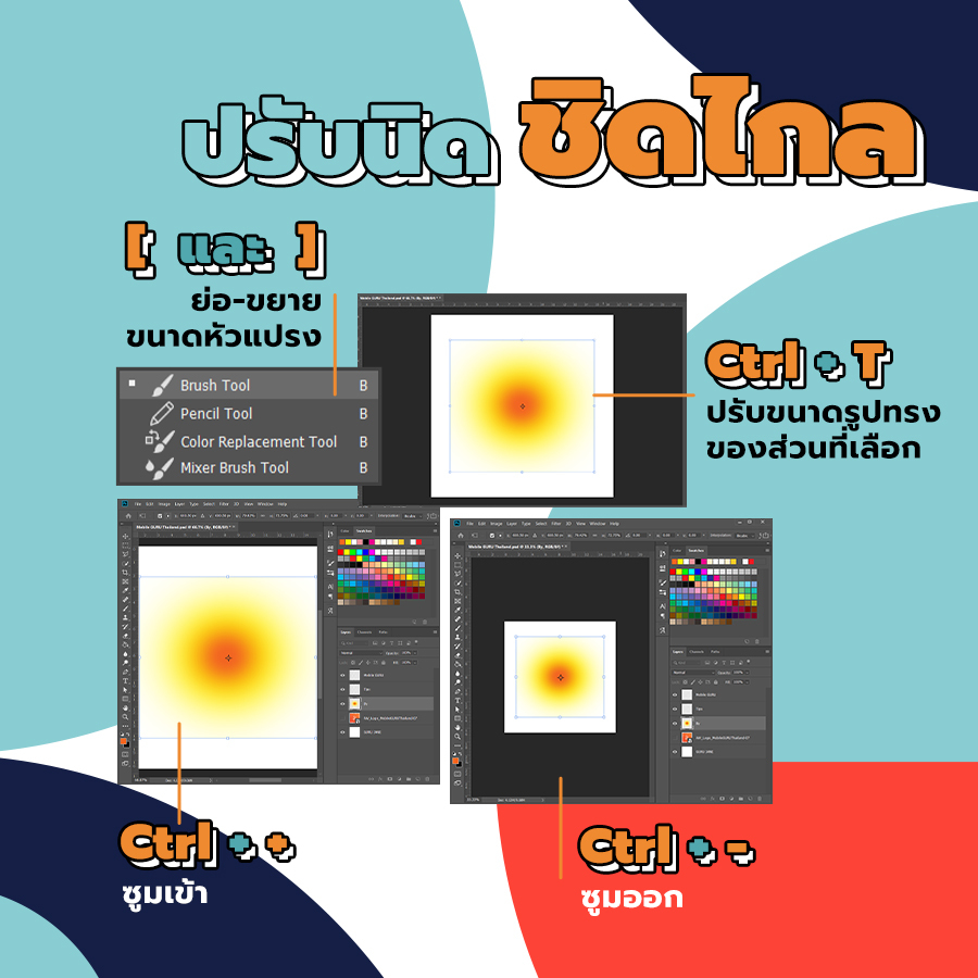 เมื่อมีการใช้งานแปรงทาสี หรือบรัช (Brush) ส่วนใหญ่ก็มักจะต้องมีการปรับขนาดหัวแปรงเพื่อให้เหมาะกับพื้นที่ของรูปที่เราทำงานอยู่เป็นประจำ ครั้นจะให้คลิกเม้าส์เลือกย่อ-ขยายที่ละสเตปก็คงจะเสียเวลาน่าดู ดังนั้นการใช้คีย์ลัดอย่าง [ ย่อหัวแปรง และ ] ขยายหัวแปรง จึงเป็นทางที่ทำได้เร็วและง่ายที่สุด