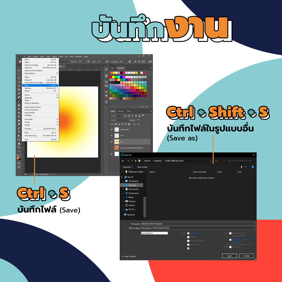 หลังจากตกแต่งรูปได้ตามที่ต้องการแล้ว สำคัญที่สุดเลยก็คืออย่าลืมเซฟไฟล์กันด้วยนะ บางคนทำเพลินจนลืม พอโปรแกรมดับขึ้นมาทีก็หายไปทั้งแผง ต้องเริ่มใหม่หมดเลยก็มี โดยคีย์ลัดการบันทึกหลัก ๆ ก็มี Ctrl + S กดบันทึกไฟล์ระหว่างทำไปด้วย และ Ctrl + Shift + S สำหรับการบันทึกไฟล์ในชื่อหรือรูปแบบอื่น