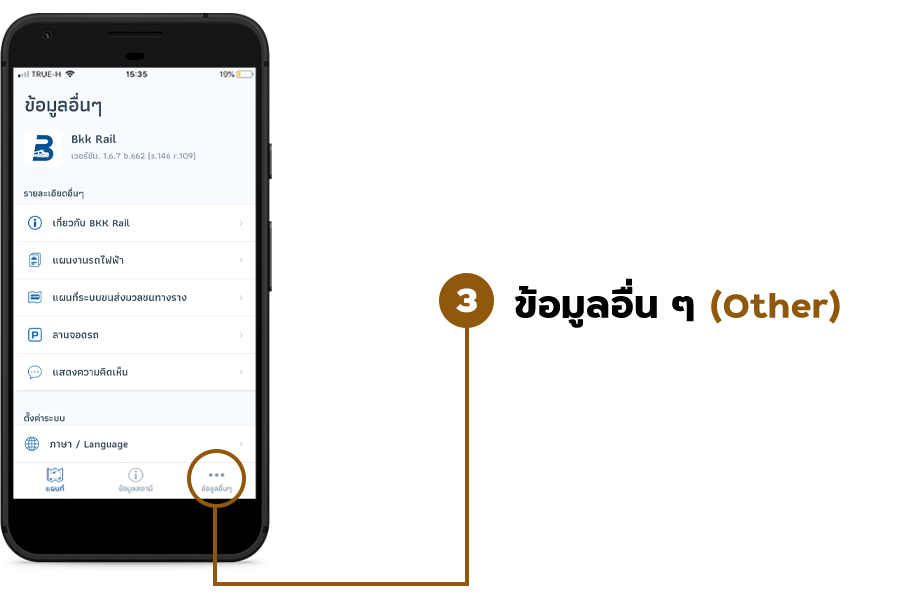 "ข้อมูลอื่น ๆ" เป็นเมนูแสดงข้อมูลรายละเอยดเพิ่มเติมต่าง ๆ ของแอปพลิเคชั่น โดยจะแบ่งออกเป็น 5 เมนูย่อย คือ (1) เกี่ยวกับ BKK Rail แสดงข้อมูลความเป็นมาของแอปพลิเคชัน (2) แผนงานรถไฟฟ้า แสดงสถานะความคืบหน้าโครงการรถไฟฟ้าสายต่าง ๆ ที่กำลังจะแล้วเสร็จในอนาคต โดยจะมีข้อมูลโครงการแบบค่อนข้างละเอียดเลย (3) แผนที่ระบบขนส่งมวลชนทางราง หน้าแสดงแผนผังภาพรวมของเส้นทางรถไฟฟ้าทุกสาย พร้อมรายชื่อของหน่วยงานที่กำกับดูแล (4) ลานจอดรถ แสดงจำนวนที่ว่างอาคารจอดรถของ MRT สถานีต่าง ๆ โดยมีข้อมูลแสดงจำนวนที่ว่างที่เหลืออยู่ รวมไปถึงข้อมูลภาพรวมทั้งหมดของลานจอดรถ ทั้งจำนวที่จิดทั้งหมด อัตราค่าบริการที่จอดรถ และการให้บริการจอดรถรายเดือน