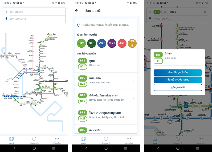 "แผนที่" เป็นเมนูแสดงผลแผนที่เส้นทางรถไฟฟ้า ซึ่งเป็นหน้าที่เราจะใช้สำหรับการค้นหาเส้นทางการเดินทางต่าง ๆ ทั้ง BTS, MRT และ ARL โดยสามารถพิมพ์ค้นหาสถานีด้วยชื่อหรือรหัสสถานีลงในช่อง 'สถานีต้นทาง' และ 'สถานีปลายทาง' เช่น ถ้าต้องการจะออกเดินทางจากสถานีชิดลม ก็สามารถพิมพ์ค้นหา 'ชิดลม' หรือ 'E1' ได้เลยค่ะ หรืออีกหนึ่งวิธีคือ ใช้นิ้วจิ้มตรงจุดสถานีที่ต้องการ ก็จะมี Pop-up เด้งขึ้นมาให้เราเลือกเซ็ตว่าจะให้สถานีที่เราเลือกนี้เป็นต้นทางหรือปลายทางก็ได้ นอกจากนี้ เรายังสามารถเลือกดูรายละเอียดข้อมูลเพิ่มเติมของสถานีนั้น ๆ ได้อีกด้วย