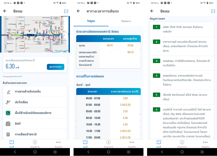 "ข้อมูลสถานี" เป็นหน้าแสดงผลรายการสถานีต่าง ๆ ที่มีอยู่ในระบบ ซึ่งจะแสดงเส้นทางรถไฟสายต่าง ๆ ให้เลือกดูข้อมูล แบ่งตามสีของสายรถไฟฟ้าอย่างชัดเจน สามารถค้นหาสถานีได้เหมือนกับในเมนูแผนที่ (Map) เลยค่ะ ซึ่งส่วนนี้ข้อมูลจะซิงค์กัน โดยในหน้าของข้อมูลแต่ละสถานี จะแสดงข้อมูลแผนที่ของสถานีนั้น ๆ ความถี่ของขบวนรถในตอนนี้ เช่น ระยะเวลาต่อขบวน 6.30 นาที โดยเรายังสามารถดูตารางเวลาการเดินรถ ความถี่ในการปล่อยรถของแต่ละวันได้ด้วย รวมไปถึงรายละเอียดของสิ่งอำนวยความสะดวกภายในสถานี เช่น ทางเชื่อมเข้าสถานี, บันไดเลื่อน, ลิฟท์, ห้องน้ำ, ทางลาดสำหรับรถเข็น, ห้องพยาบาล, Wi-Fi ฯลฯ พร้อมข้อมูลทางออกว่าแต่ละประตูสามารถเชื่อมต่อไปยังสถานที่สำคัญ ๆ ที่ไหนบ้าง