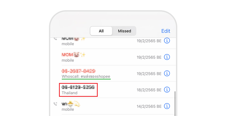 โดยทั่วไปแล้ว Whoscall จะทำการระบุที่มาของหมายเลขปลายทางโดยอัตโนมัติทันทีว่าคือใคร (ตามตัวอย่างขีดเส้นใต้สีเขียว) แต่ก็มีบางครั้งที่ไม่ได้ระบุชื่อด้วยเช่นกัน (ตามตัวอย่างกรอบสีแดง)