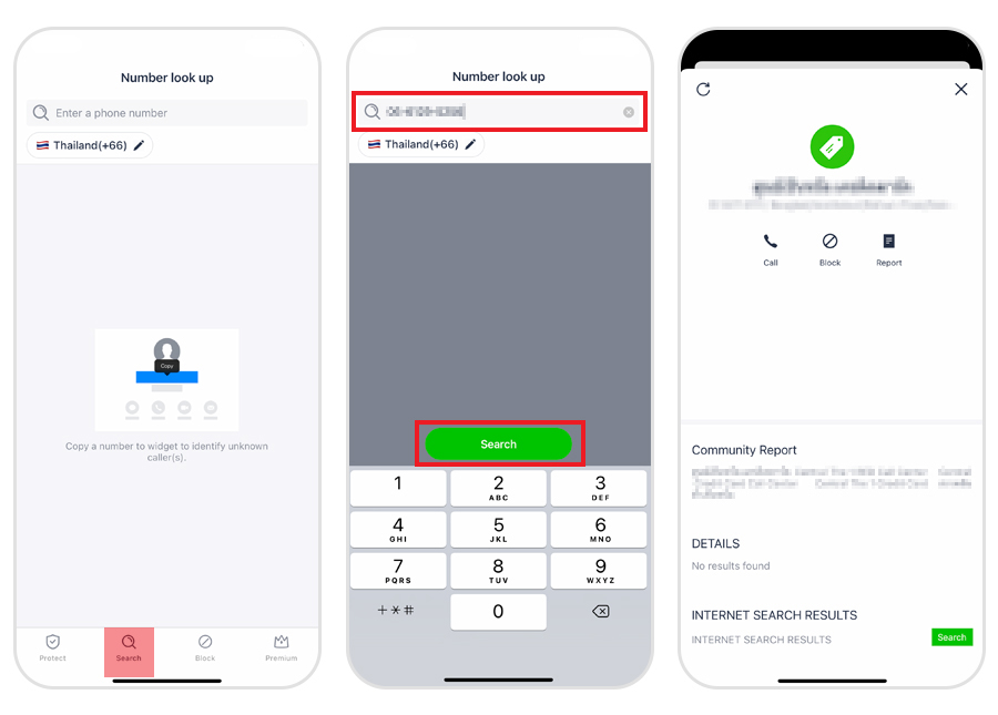 - กรอกหรือวางหมายเลขโทรศัพท์ลงในช่อง แล้วกด ค้นหา (Search)