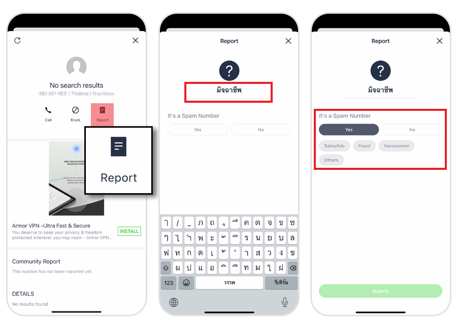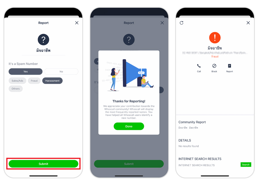 เชื่อว่าหลายคนเคยเจอสถานการณ์คล้ายกัน นั่นคือเจอหมายเลขที่ไม่ระบุที่มา เผลอกดรับสายไปแล้ว คุยไปคุยมาสักพักถึงรู้ตัวว่ากำลังสนทนากับสายที่ไม่พึงประสงค์ ไม่ว่าจะเป็นเหล่ามิจฉาชีพ หรือพวกหลอกขายในรูปแบบต่าง ๆ ซึ่งเป็นไปได้ว่าอาจเป็นหมายเลขใหม่ที่เพิ่งเปิดใช้บริการทำให้ไม่มีข้อมูลอยู่ในฐาน หรือมีแล้วแต่ไม่ได้รับการระบุว่าเป็นหมายเลขที่มีความเสี่ยง แต่เมื่อเจออย่างนี้แล้ว เราอย่านิ่งเฉย มากด "รีพอร์ต" เพื่อส่งข้อมูลให้ Whoscall ได้อัปเดทและป้องกันเราต่อไปในอนาคตกันดีกว่า