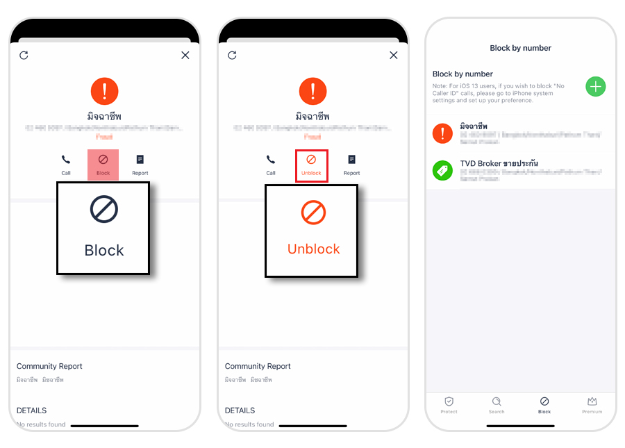 การบล็อกมีด้วยกันสองวิธีค่ะ วิธีแรกคือการเปิดไปยังข้อมูลของหมายเลขดังกล่าว แล้วแตะเลือกที่ บล็อก (Block) จากนั้นสัญลักษณ์การบล็อกจะถูกเปลี่ยนเป็นสีแดง ถือเป็นอันสำเร็จ และหมายเลขที่ถูกบล็อกจะแสดงอยู่ในหน้าคำสั่งบล็อก (ฺBlock) โดยอัตโนมัติ