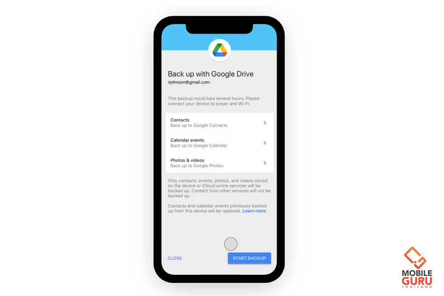 ขั้นตอนต่อมาก็คือ การเข้าไปเลือก "Back up" ข้อมูลบนตัวเครื่องอย่างเช่น เบอร์ติดต่อใน Contact, ตารางงานหรือกิจกรรมใน Calendar และรูปภาพ-วีดีโอบนตัวเครื่อง เพื่อสำรองข้อมูลเข้าสู่แอปพลิเคชั่น Google Drive ที่เราดาวน์โหลดและสมัครบัญชีไว้ เมื่อเลือกข้อมูลที่ต้องการเสร็จแล้วก็กดปุ่ม "Start Back up" จากนั้นก็รอแล้วก็รอเพียงอย่างเดียวครับ