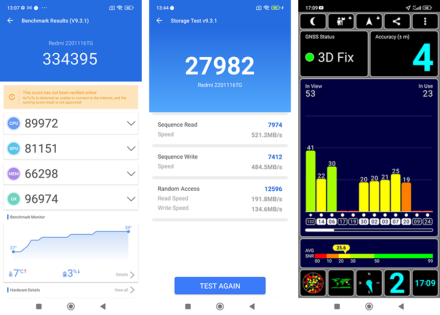 - ทดสอบความเร็วในการอ่าน-เขียนของหน่วยความจำด้วยแอปพลิเคชัน Antutu Benchmark ได้ Sequential Read 521.2 MB/s และ Sequential Write 484.5 MB/s