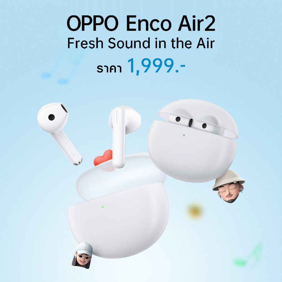 OPPO Enco Air2 หูฟังไร้สายรุ่นใหม่ล่าสุดของ ออปโป้ ที่เปิดตัวมาในสโลแกน "Fresh Sound in the Air" ดีไซน์สวย โดดเด่นด้วยเคสชาร์จแบบโปร่งแสง พร้อมมอบประสบการณ์การฟังที่คุ้มค่าเหนือราคา ด้วยคุณภาพเสียงใส คมชัด ทรงพลัง ในราคา 1,999 บาท