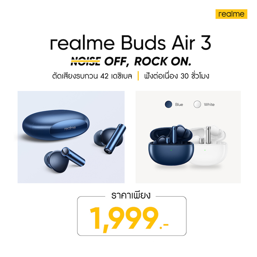 realme Bud Air 3 มาในสโลแกน "Noise Off, Rock on." เป็นหูฟังรุ่นแรกในอุตสาหกรรมที่ผ่านการรับรองมาตรฐาน TÜV Rheinland High Performance Noise Cancellation รองรับการใช้งานที่ยาวนานขึ้นด้วยแบตเตอรี่มากถึง 546 mAh ฟังเพลงต่อเนื่องได้ยาวนานถึง 30 ชั่วโมง และมาพร้อมระบบชาร์จเร็ว สามารถชาร์จไฟเต็ม 100% ได้ในเวลา 1 ชั่วโมง (ชาร์จ 10 นาที สามารถฟังเพลงได้นาน 100 นาที) มีให้เลือก 2 สี คือ สีน้ำเงิน Blue และสีขาว White ในราคาวางจำหน่าย 1,999 บาท