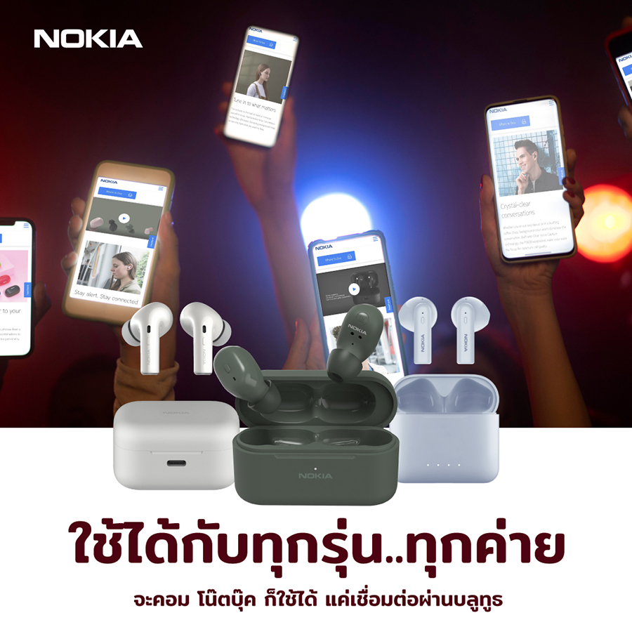 หูฟังไร้สาย True Wireless ภายใต้แบรนด์ Nokia ที่ปีนี้ออกมาลุยตลาดทางฝั่งนี้แบบหนัก ๆ กับเขาบ้าง โดยเน้นคุณภาพ และความคุ้มค่าเป็นหลัก ออกแบบให้สามารถใช้งานร่วมกับสมาร์ตโฟนค่ายต่าง ๆ ได้ รวมถึงอุปกรณ์อย่างโน้ตบุ๊ก หรือคอมพิวเตอร์พีซีที่มีบูลทูธ พร้อมออกแบบมาให้มีสีสันสดใส สามารถเลือกใช้งานได้ตามไลฟ์สไตล์ของแต่ละคนได้อย่างไม่มีเบื่อ มีมาแนะนำด้วยกัน 4 รุ่น ได้แก่